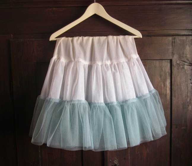 Den Petticoat hier habe ich für das Tanzstundenabschlussballkleid meiner jüngeren Tochter genäht (weiter unten zu sehen). Verwendet habe ich dafür drei verschiedene Stoffe. Die obere Stufe ist aus Wirkfutter (auch von Folhoffer, aber deutlich weicher als das schwarze), die mitttlere Stufe aus Petticoatstoff von Buttinette, die untere aus Tüll von The Tulle Factory. Für das Kleid ist der Petticoat genau richtig, der Tüll unten ist allerdings ziemlich weich. Wer einen sehr stabilen Petticoat möchte, ist mit dem Petticoatstoff von Buttinette gut bedient und müsste auch die untere Rüsche daraus machen.